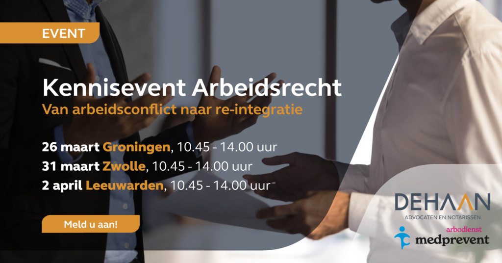 DeHaan Advocaten en Notarissen en Arbodienst Medprevent organiseren samen drie kennisevents om jou als HR-professional of werkgever te voorzien van praktische en juridisch correcte handvatten om als werkgever zorgvuldig én effectief met deze situaties om te gaan. Tijdens de sessies wordt stilgestaan bij arbeidsconflicten en re-integratie: wat moet, wat mag en wat werkt?